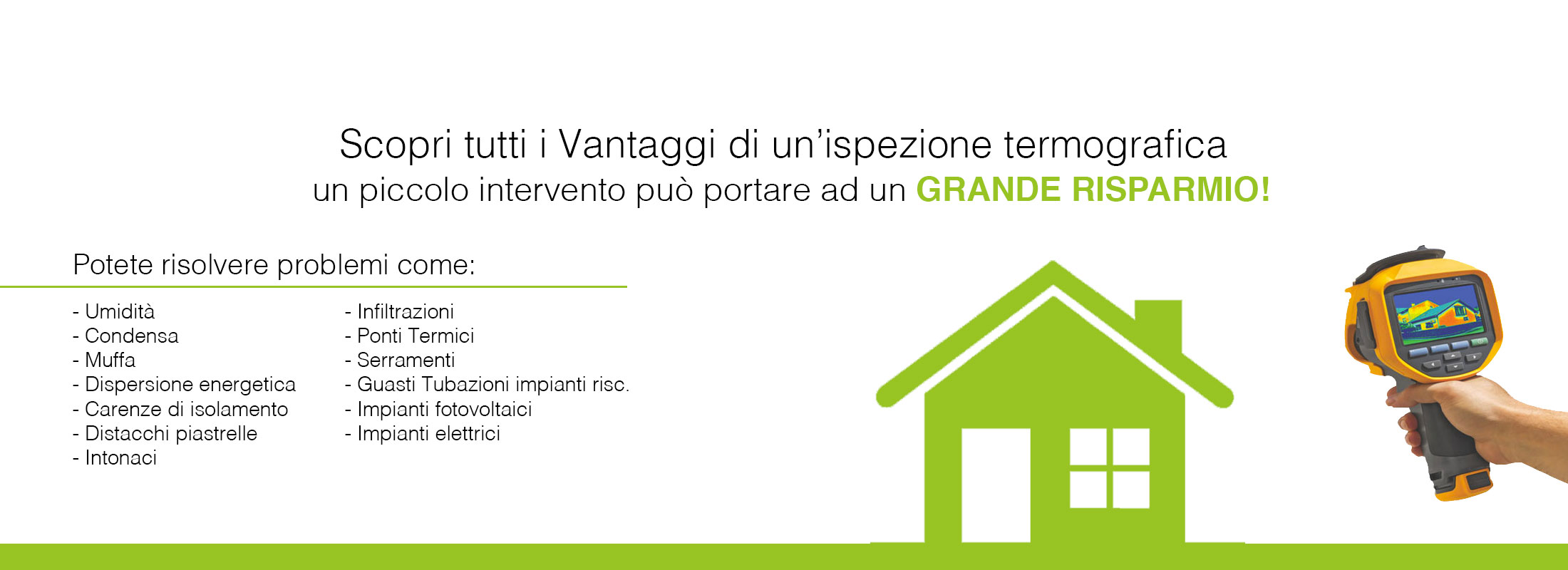 Umidità, condensa, muffa, dispersioni energetiche degli edifici, carenze di isolamento, distacchi di piastrelle, intonaci, infiltrazioni, ponti termici,  serramenti, guasti tubazioni impianti riscaldamento, impianti fotovoltaici e impianti elettrici.